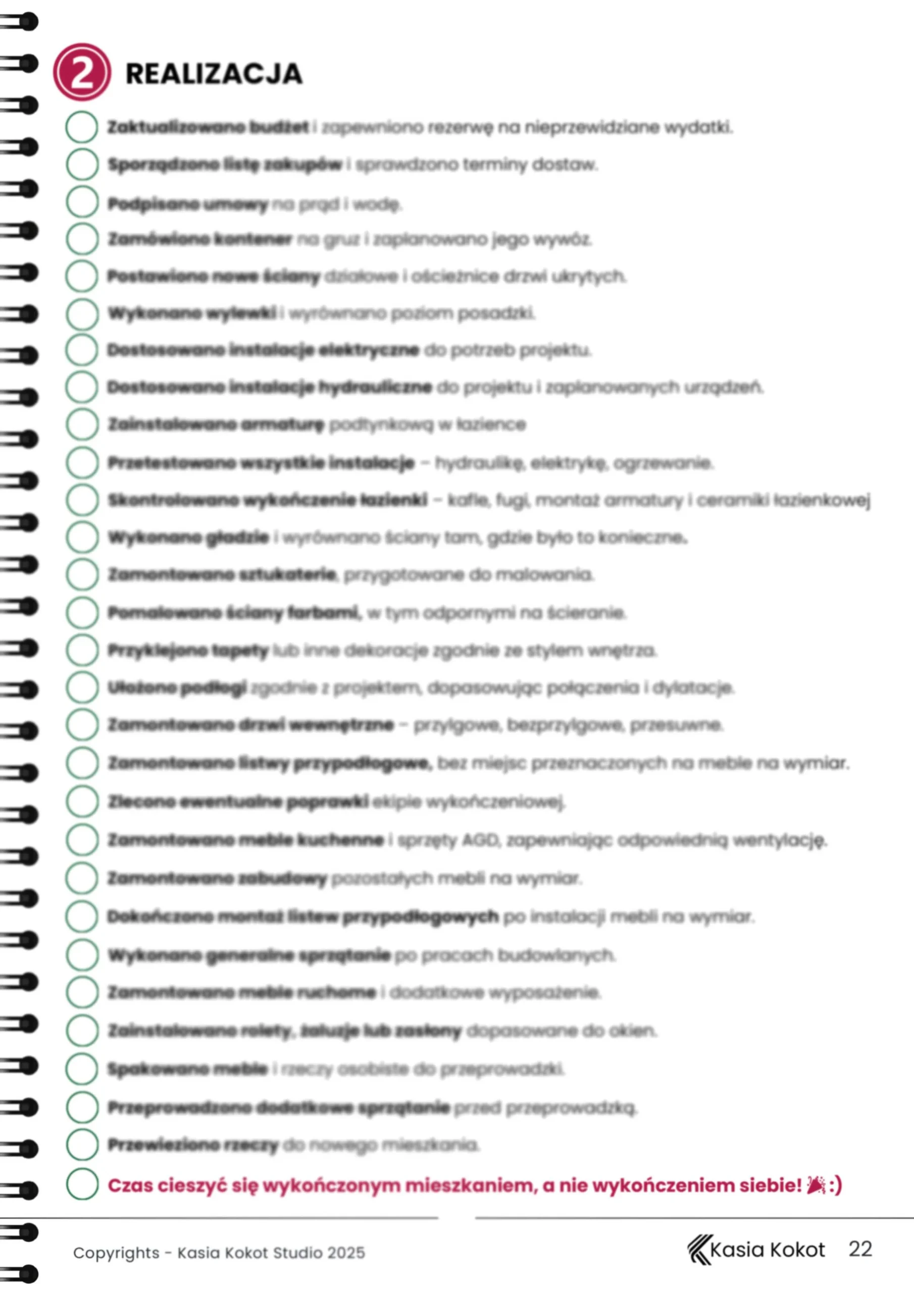Już po fakcie widzę, jak wiele rzeczy można było zrobić lepiej. Niektóre decyzje podjęłam za późno i musiałam dopłacać za poprawki. Ten przewodnik porządkuje cały proces i pomaga myśleć kilka kroków naprzód. Gdybym go miała wcześniej, oszczędziłabym sporo nerwów i pieniędzy.